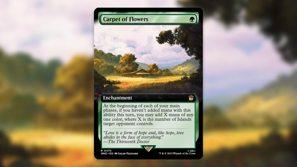 The recent Doctor Who Commander deck expansion is a great way to show off what a card with a more narrow design can do in an environment where it flourishes. Seeing MTG Carpet of Flowers in a preconstructed deck is definitely a strange move. These Doctor Who decks, however, are meant to be played against each other, and every single one has blue in it. This is meant to emulate the smarts of the characters in the Doctor Who franchise, constantly trying to outwit oneanother with complex planning.