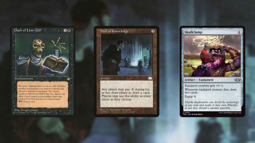 This allows both Oath of Lim-Dul and Well of Knowledge to draw your entire deck in one go, opening the door for Thassa’s Oracle kills. You can also use some three-card combos, like Reassembling Skeleton, Skullclamp and Cadaverous Bloom to do the same things. This Skullclamp variant of the combo is doable with any recurrable one toughness creature, so long as you pay at least three mana to bring it back. Since most of these options end up being cheaper, you’re also gifted with infinite mana, or at least as much mana as you have cards to draw.