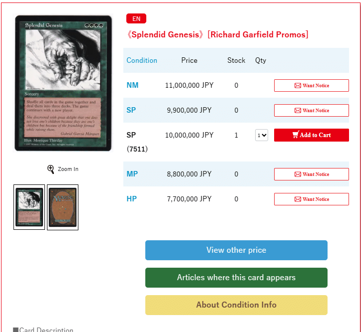 Earlier this week, for the first time in almost a year, a copy of Splendid Genesis was identified to be for sale. The current asking price for this card on Hareruya’s shop is 10,000,000 JPY. This converts to about $68,400 USD. The sale appears to be for a copy of one of the more common Splendid Genesis variants in lightly played condition. That said, we cannot confirm this.