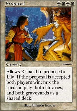 Proposal is the white card in this cycle that Richard Garfield literally used to successfully propose to his girlfriend Lily in a game of Magic. The following quote comes from our past article discussing these cards: