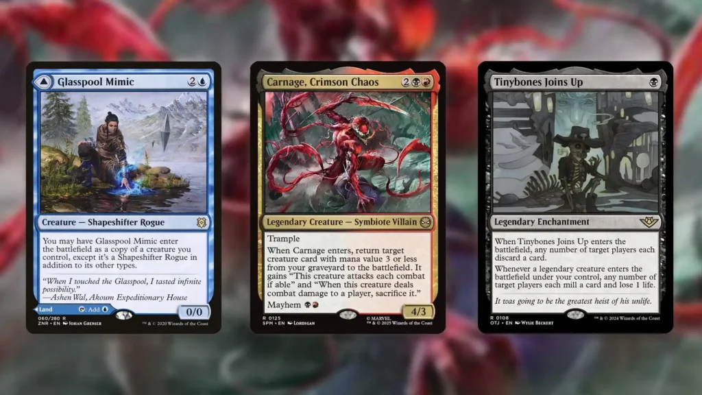 What the card does extremely well, however, is initiate combo kills alongside Glasspool Mimic. Because Carnage is a legend, if you choose to resurrect Mimic with Carnage’s enters ability and then copy Carnage, you’re able to then sacrifice Mimic via the “Legend Rule”. Then, when Mimic’s triggered ability resolves, it can resurrect itself, letting you copy Carnage again and create an infinite loop.