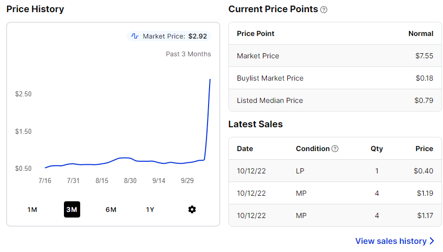 It is important to note that this card is currently experiencing a buyout. This means that the card has seen a massive increase in quantities sold, resulting from some parties targeting the card to try and raise its price. This can be seen in TCGplayer sales history, where some orders have been recorded buying dozens of copies simultaneously. As a result, there is a more substantial chance that this card will likely experience a false zenith before stabilizing.