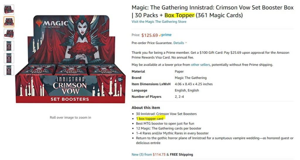 The next Magic: the Gathering set is just around the corner with spoilers starting on October 28th. Players are gearing up for the big vampire wedding. But the thing I’m most excited about is the box toppers coming with the set. Wait, there are box toppers in Innistrad: Crimson Vow??? According to an Amazon listing for the Crimson Vow set booster box, yes there are: