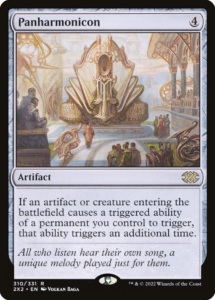 This is actually better than the namesake card since there’s no restriction on the permanent type causing the copy trigger. Basically, Panharmonicon effects offers additional triggers of things under certain scenarios, and entering the battlefield to trigger the thing is the most common instance of these cards.