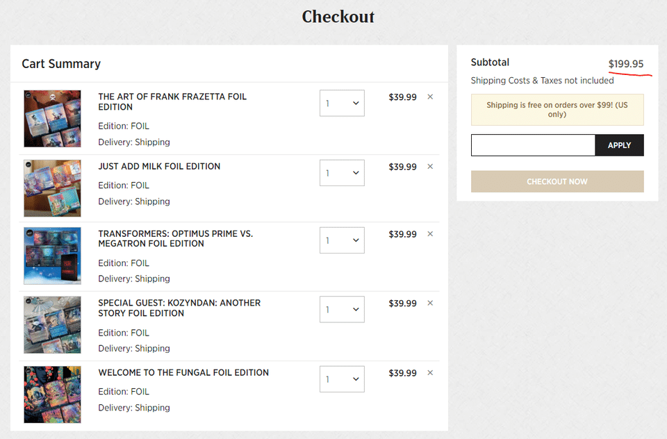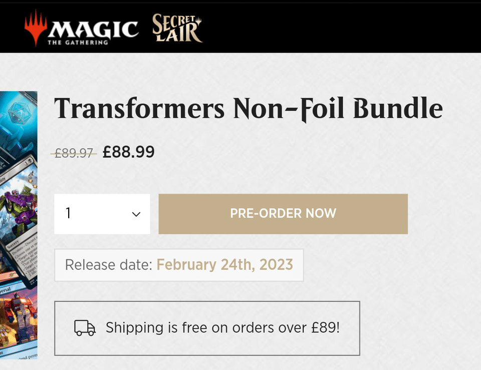 As pointed out in the picture above, the very slight discount offered by Wizards of the Coast puts some bundles below their free shipping mark for orders over 89 Euros. Without the dollar discount, this product would be eligible for free shipping. Notably, the same cannot be said for the US Secret Lairs, where this product is still $10 under the free shipping marker of $99.