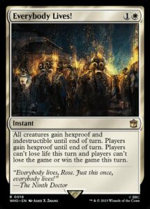 More Dr. Who spoilers are trickling out, and the single card that has me most excited by far is MTG Everybody Lives!. The card is interesting on multiple levels from one versus one to multiplayer and has diplomatic value on top of it all. Furthermore, it shows that Wizards still has some respect for the color pie and found a way to make white work without crazy power creep. Finally, I’m told the card is also a triumph in terms of flavor, so this card is perfectly designed.