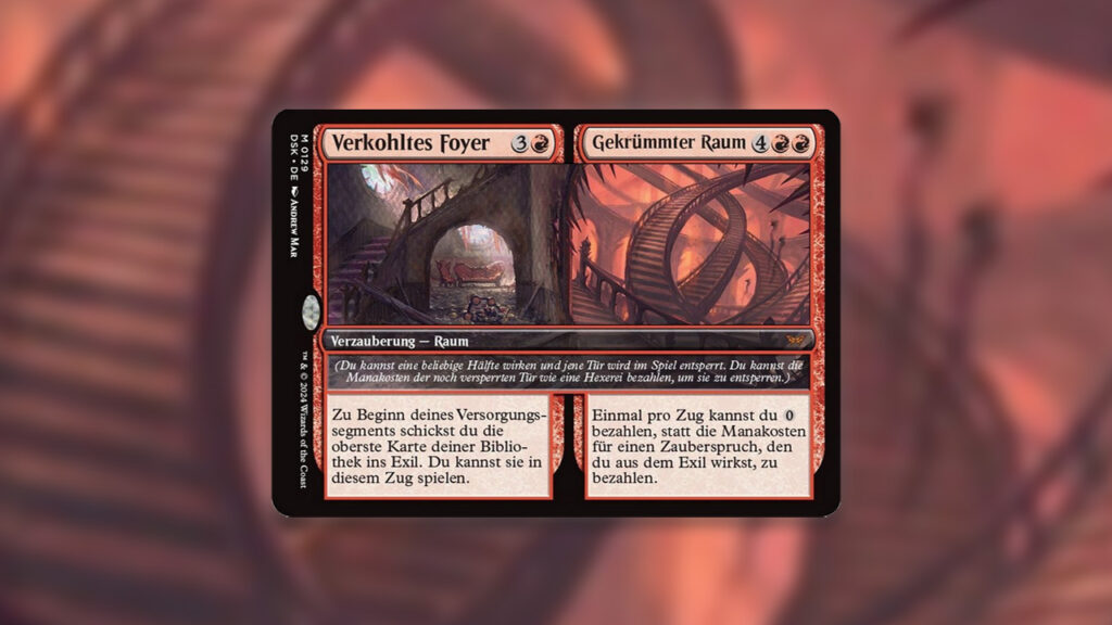We’re not entirely sure what the name of this red Room enchantment is yet since it’s currently in German. Despite this missing information, we still know this Room is capable of granting Commander players two things that they direly need: huge tempo swings and card advantage. The four mana Room offers an Impulse draw during your upkeep, while the other Room can play one free card from exile on each turn. Notably, this isn’t just your turns, but your opponent’s as well.