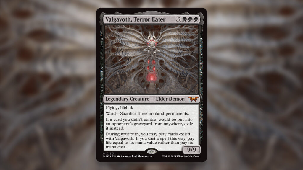 As a creature, Valgavoth is very difficult to get rid of once it enters play. Sacrificing three nonland permanents makes this creature tough to even target, and anything your opponents lose turns into your strength. Thanks to Lifelink, you should never run out of life to play your opponent’s spells.
