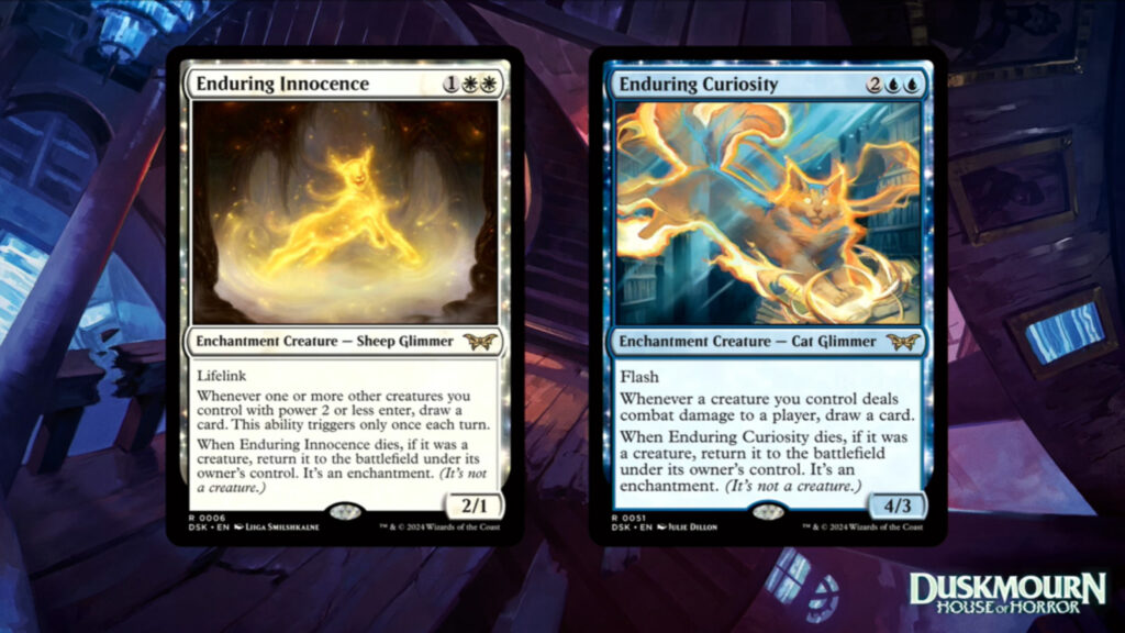 A new cycle of Enduring enchantment creatures are coming in Duskmourn. Representing a glimmer of hope for those trying to survive on the plane, these creatures have the potential to come back as enchantments after they die. Of course, this also means that, should you flicker these as enchantments, they can come back as creatures once again.