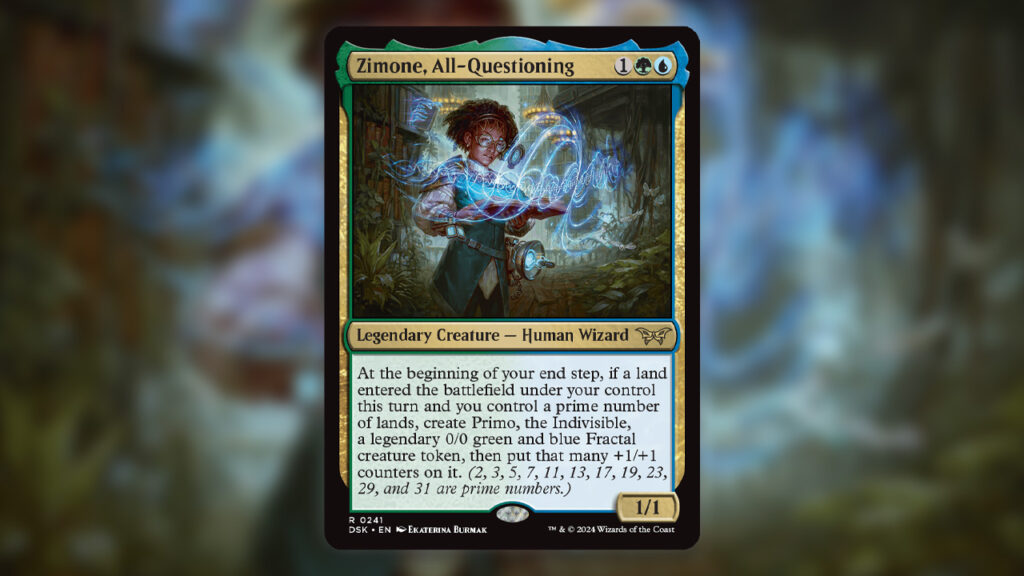 A very flavorful card, Zimone truly harnesses the power of math. this card can create a ton of board presence when you play to it. As mentioned during the reveal of this card, the prime number of lands can be manipulated in some really interesting ways when you use sacrifice lands like Fetch Lands or Evolving Wilds. Simply don’t find a land, and you can reset your prime land count while playing a land.