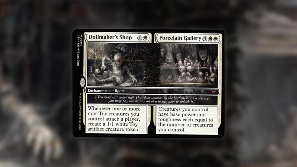There’s a lot to break down with this card. Dollmaker’s Shop and Porcelain Gallery demonstrate our first MTG Room enchantment. Basically, you cast one of these split enchantment cards and have them enter play. The other portion of the Room can be unlocked whenever you like by paying its mana cost when the Room is on the battlefield. Think of it like Leveling up a Class Enchantment.