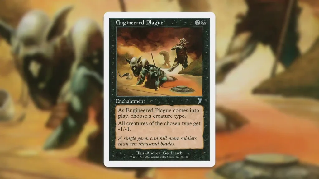 Importantly, though, there are a couple ways to pick up Engineered Plague at a bit of a discount. For players still looking for non-foil copies in near mint condition, the Urza’s Legacy variant is selling for $8.99 at the time of writing. While there unfortunately isn’t a big dropoff for moderately played or even heavily played copies from either set, there are at least damaged Seventh Edition copies on sale starting at $3.30, including shipping.