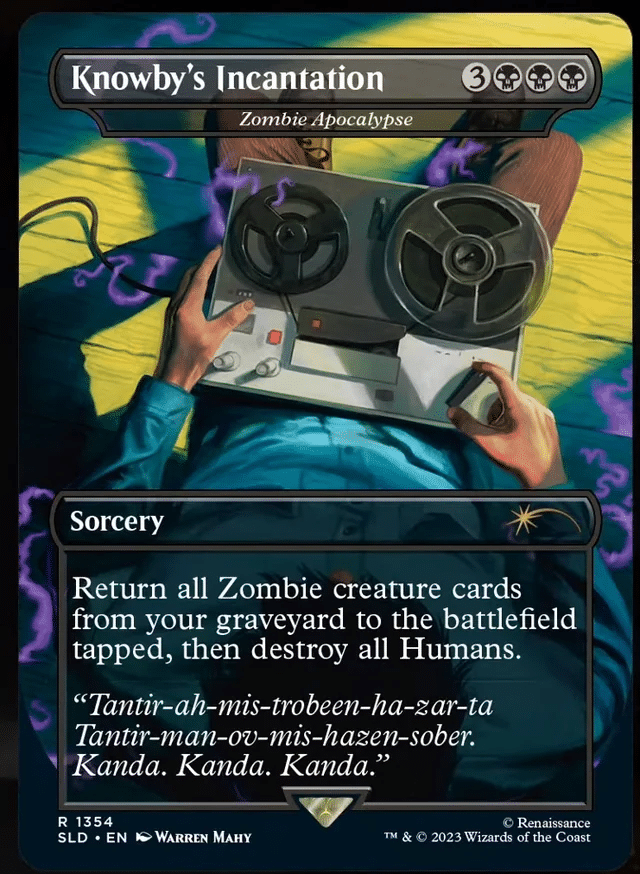 The alternate version of Zombie Apocalypse shown above is another great example of the worlds of MTG and the Evil Dead being meshed. The artwork showcases the tape recording of Knowby’s Incantation that would lead to the Kandarian Demon’s appearance. Many of these cards, including Field of the Dead and Zombie Apocalypse, are likely meant to show off the effects of the Deadites that were capable of possessing the dead.