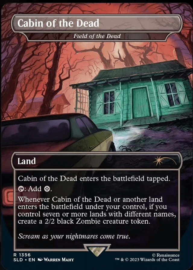 The goal of these cards is to showcase previously created MTG cards in a new light that directly resembles the franchise featured in the crossover. In this case, given that the crossover revolves around the Evil Dead IP, there are lots of cool references to the horror film franchise. Take a look at this new variant of Field of the Dead, for example. The new title and artwork showcase the cabin in which the reawakening of the Kandarian Demon occurs.