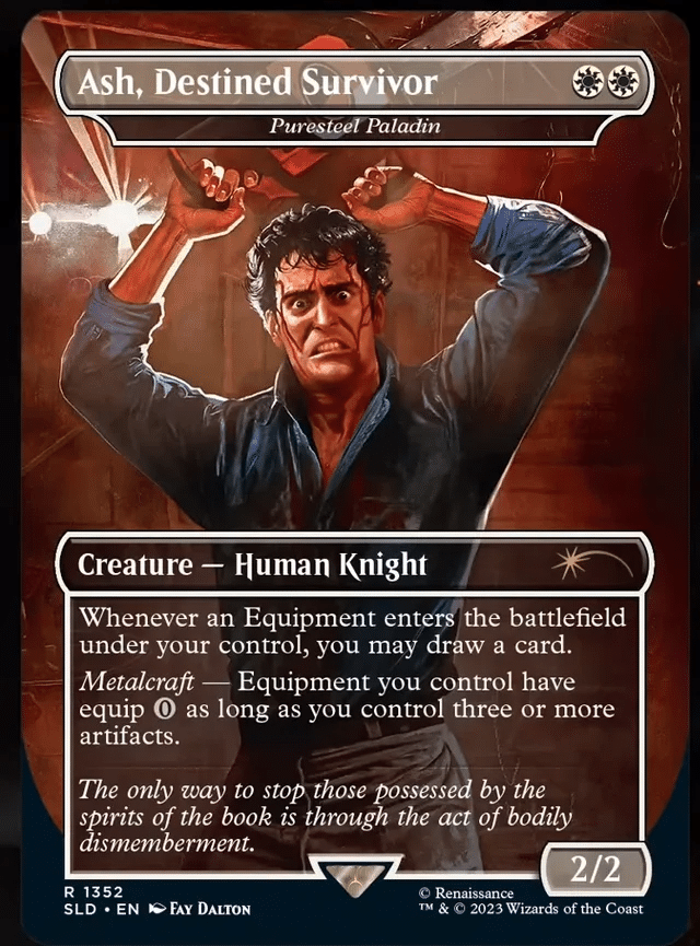 In addition to directly referencing specific parts of the story, multiple cards from the Evil Dead Secret Lair were designed to show off a major character from the Evil Dead franchise. Because these cards are ultimately reprints, the hope was to have the abilities of a previous MTG card somewhat closely resemble that of the main character in question. In the case of Ash, Destined Survivor, the Equipment theme makes a decent amount of sense. This card features alternate art of Puresteel Paladin, which greatly benefits from playing lots of Equipment. Ash is well-known for incorporating both a chainsaw and a boomstick to his arsenal to help fight against evil, so utilizing this card does make some sense.