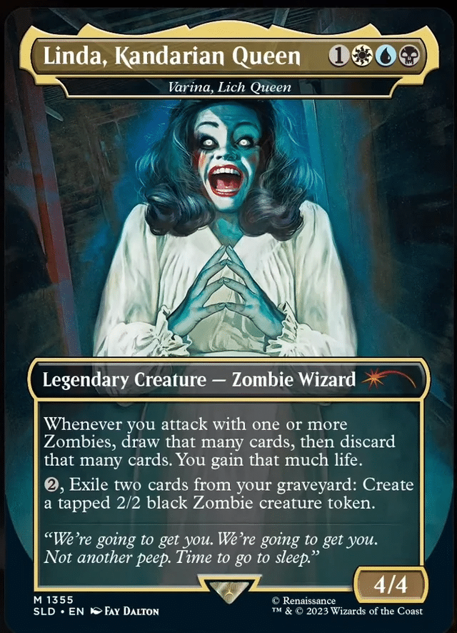 Beyond Ash, we also get to see Linda, someone who went with Ash to the Tennessee cabin. Starting out as a character that Ash had some infatuation with, Linda would eventually become a Deadite herself. She even tried to kill Ash but was unsuccessful. Given the name “Linda, Kandarian Queen,” this card almost certainly resembles Linda after falling victim to possession.