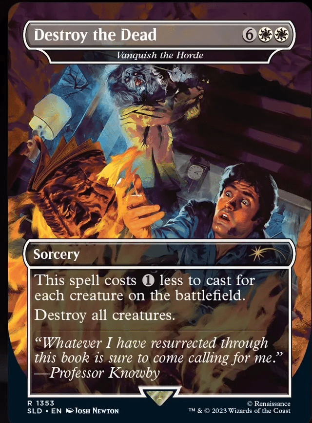 The last reprint featured is none other than Vanquish the Horde. Based on the image and flavor text, it appears that this card references Ash learning that he needed to bury the book at the cabin where the start of his journey took place. All five of these cards have unique flavor text, titles, and artwork that make the Evil Dead Secret Lair a very cool product overall.