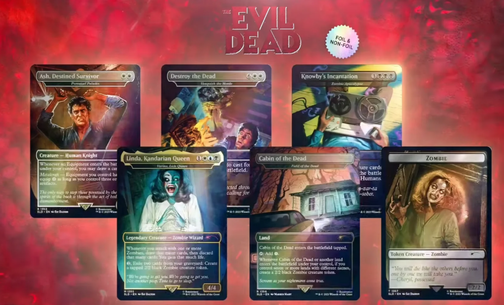 In conjunction with the Lost Caverns of Ixalan, we are getting Jurassic World cards that can be found in set boosters and collector boosters. Multiple Secret Lair crossovers were announced, such as the unique Princess Bride Secret Lair. Today, we will be covering yet another Secret Lair crossover showcasing the Evil Dead IP. The Evil Dead Secret Lair will become available for purchase on October 2, 2023 as part of the Spookydrop 2023.