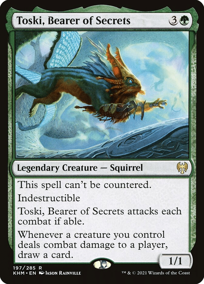 Between Sarulf and Toski as MTG cards, Toski unquestionably got to see more play during its time in Standard. Toski, Bearer of Secrets, is a rather pesky MTG card that can be pretty difficult to deal with. The little squirrel is indestructible and cannot be countered. It can also draw its owner a pile of cards as long as many creatures manage to connect with an opponent. The downsides mitigate things a bit – Toski can’t really block outside of its summoning sickness turn and won’t deal much damage on its own due to its subpar stats. The upside, however, far outweighs the downside, making this card quite powerful in creature-based Commander decks. This could partially cause the love for Toski over Sarulf, but Toski is also a squirrel, a beloved creature type by many in the EDH community.