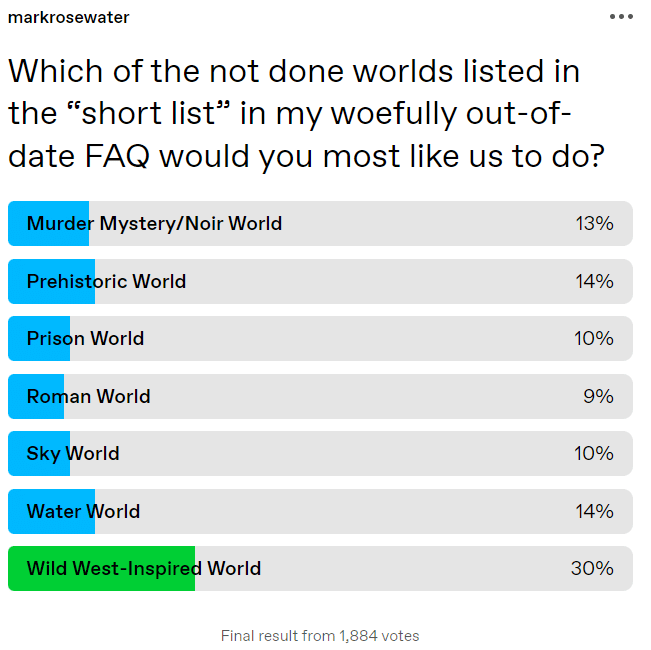 Finally, juuuuuuuush was split between the wild west and a water world: “I’m torn because Wild West has a massive trope space and would probably lead to some really resonant designs, whereas Water World I can imagine leading to the most stunning artwork. Voted Water World because I like pretty things I guess.”