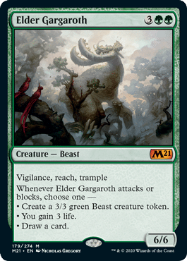 To preface this, there’s a couple standard hits you’ll find in nearly every version of this deck, and a couple that are a bit different. Verdurous Gearhulk is one of those off beat choices, but it’s VERY good. It beefs up creatures, it has trample, what’s not to love. Elder Gargaroth is another creature that we really love hitting. It’s a big creature and very versatile. With this, we can start to build a wider board with it’s token, draw some cards, or stabilize our life total.