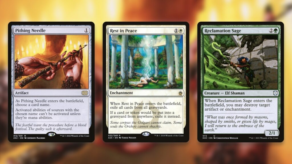 This one is an absolute must. MTG Foundations is unique in that it will be sticking around in Standard for five years. For that reason, every card printed within it carries much more weight than usual, for better or worse. One way WotC can use these long-life slots for good is to fill them with powerful sideboard tech cards. Staple pieces like Rest in Peace, Pithing Needle, and Reclamation Sage.