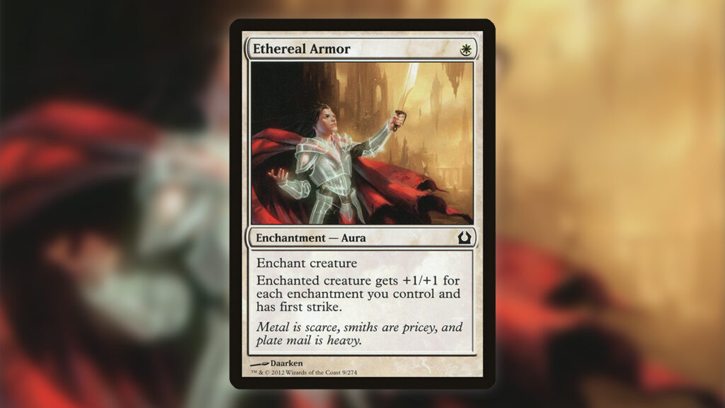 First, this deck plays multiple ways to give Geist of Saint Traft evasion to prevent the opponent from effectively blocking it. Both Arcane Flight and Gryff’s Boon give the powerful three-drop Flying as well as a small buff. Next, to help make sure Geist can end the game in short order, this deck makes great use of Ethereal Armor. Ethereal Armor not only works great alongside your Auras, but it also pumps Geist for every Leyline you have in play.