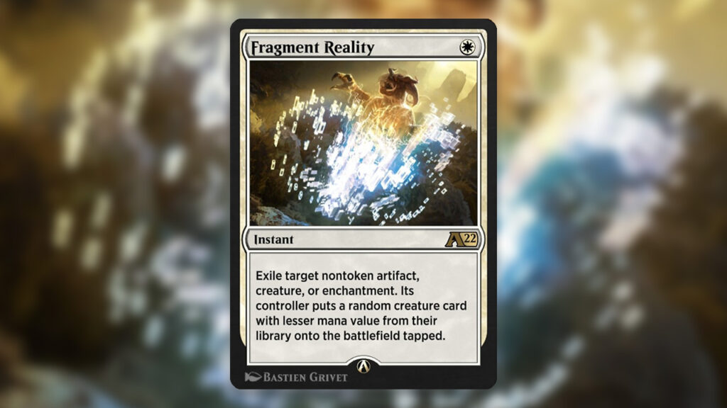 In order to execute this deck’s gameplan, you essentially need to find a copy of Fragment Reality. Fragment Reality is a one-mana Instant that allows one to exile a non-token Artifact, Creature, or Enchantment. This results in the permanent’s controller putting a Creature card with lesser mana value from their deck into play at random. For this strategy, Fragment Reality is almost exclusively going to target your own Enchantments.