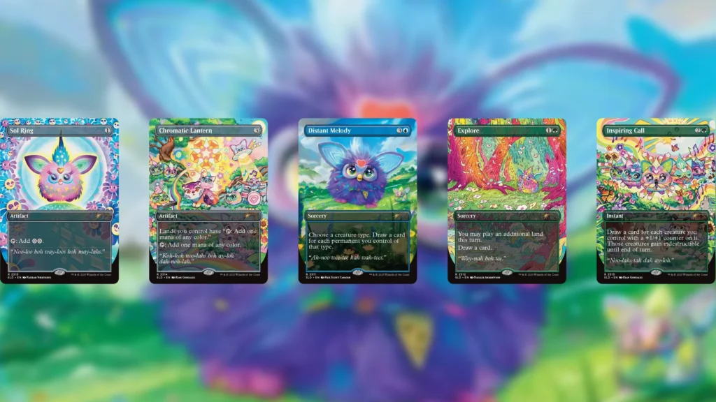 Furby: The Gathering offers some charming artwork with Hasbro’s iconic Furby character interacting with various MTG ones. It’s quite a funny scene, but many of the reprints offered in this Secret Lair are rather disappointing.