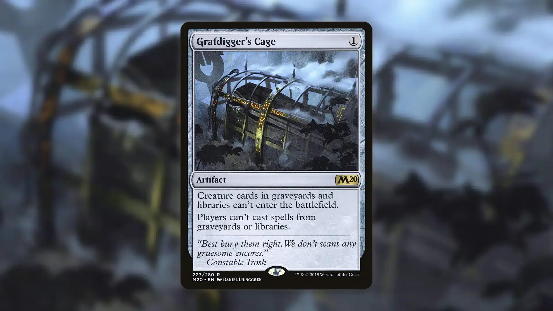 Grafdigger’s Cage is one of the oldest hate pieces in Magic. Graveyard strategies have always been powerful, and this little artifact can stop them in their tracks. Once in play, casting spells from your deck or graveyard becomes impossible, and creatures cannot enter play from either zone.