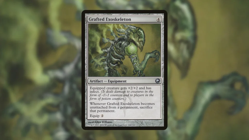 Grafted Exoskeleton, an uncommon equipment all the way back from Mirrodin, is a well-known nasty win condition, but despite that, it hardly sees any play. According to EDHREC, only 0.82% of decks actually employ the card. This is likely because Infect effects like this one earn the ire of the table immediately, like they should. Regardless, Grafted Exoskeleton has some additional synergies with recent popular MTG Commanders that make it a great inclusion if your deck is taking a little too long to close the game properly.