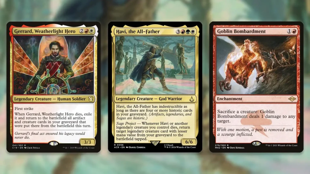 For those interested in digging a little deeper, Havi also enables a multitude of infinite combos. One of the most effective combo kills available involves landing Havi alongside Gerrard, Weatherlight Hero and Goblin Bombardment. With all three cards in play, you’ll want to start by sacrificing Gerrard to Goblin Bombardment’s ability. This will cause both Gerrard and Havi’s abilities to trigger.
