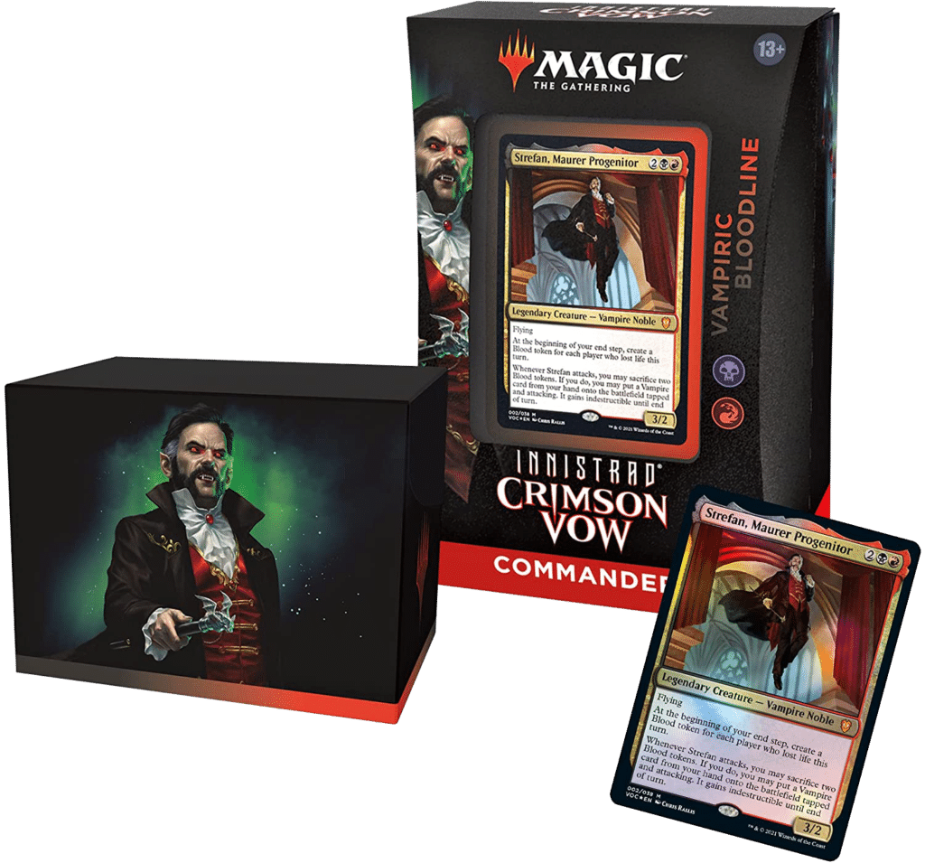 Following Innistrad: Midnight Hunt, there will be two pre-constructed Commander decks coming out alongside Crimson Vow‘s release. The first offering is Vampiric Bloodline, which has Strefan, Maurer Progenitor at the helm which creates Blood tokens to use to put Vampires into play.