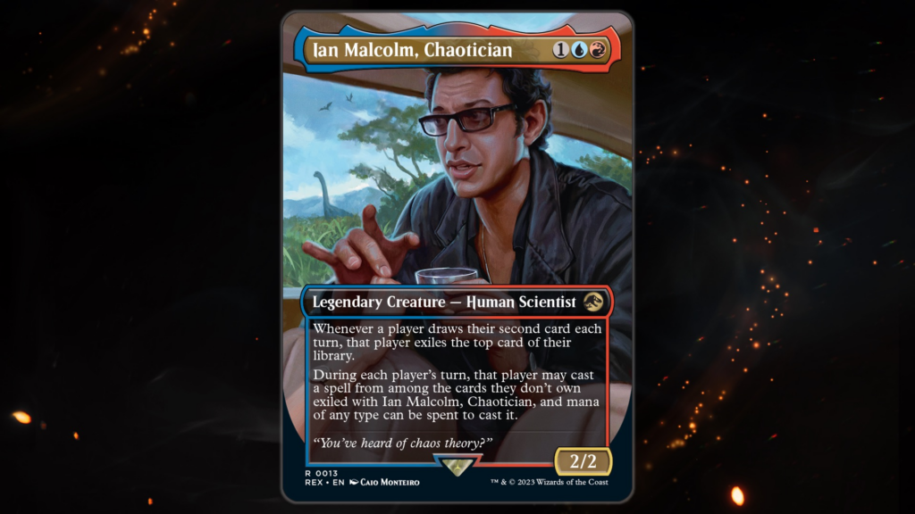 Beyond just Dinosaurs, this Jurassic World crossover has even more to showcase. Our final spoiler is none other than Ian Malcolm, Chaotician. Ian Malcolm is a super weird card, and as the name and flavor text suggests, can have a weird effect on the game. You see, every time a player draws their second card each turn, they exile the top card of their library. Additionally, during each player’s turn, they can cast a spell from among cards they don’t own exiled with Ian Malcolm, and they can spend mana of any color to cast them.