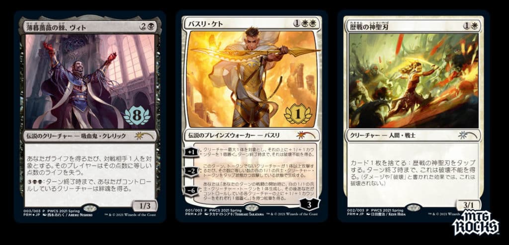 You can only acquire these cards by participating in these Planeswalker Championships in Japan. Basri Ket is the promotional card for winning the event, Vito, Thorn of the Dusk Rose is the Top 8 prize, and Seasoned Hallowblade is the participation promotional card. These aren’t the first promotional cards of its kind for the series, you can see the previous promotional cards here.