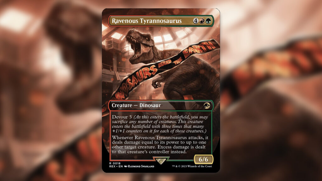 Ravenous Tyrannosaurus is capable of doling out massive points of damage. Both excess damage dealt via its attack trigger and its literal combat damage scale with how well you can satisfy the card’s Ravenous clause. Typically, you won’t want to sacrifice your other very large Dinosaurs to this one, but that doesn’t mean that your Dino can’t convert early ramping tools like Marauding Raptor into something a lot more problematic for your opponents.