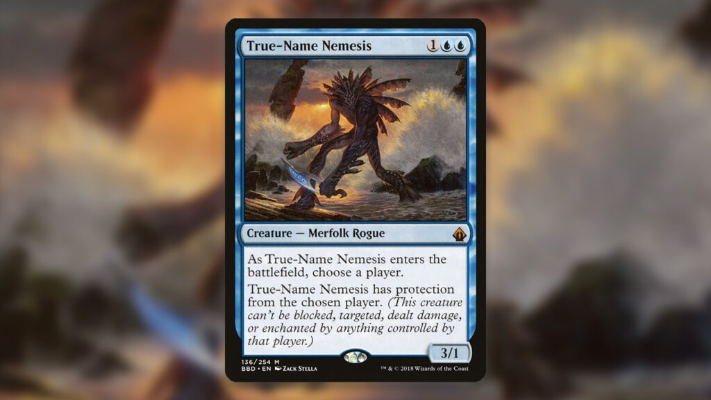 True-Name Nemesis’s time has come and gone in Legacy, but this card absolutely warped the format for many years. Gaining Protection from a player of your choice makes it incredibly difficult for opponents to interact with True-Name Nemesis. They cannot block it, deal damage to it, or target it with any effects whatsoever. The only way that they can really deal with it is removal that doesn’t target, like board wipes.