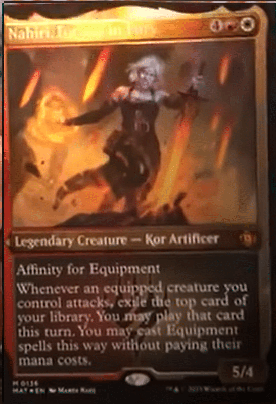 Nahri causes the top card of her controller’s deck to get exiled whenever an equipped creature they control attacks. That card can be played until the end of the turn and played for free if it is an Equipment card.