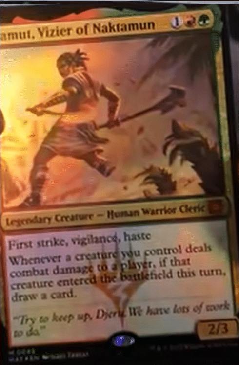 Samut, Vizier of Naktamun is a Gruul 3 mana, 2/3 with first strike, vigilance, and haste. Whenever a creature, owned by Samut’s controller deals combat damage to another play on the turn it entered play then Samut’s controller gets to draw a card.