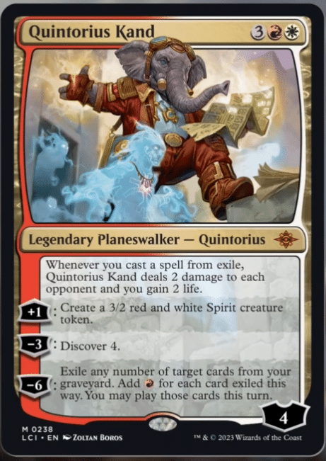 Quintorius, however, also introduces one of the new mechanics: Discover. While we talk at-length about Discover in our article covering new mechanics, you can basically think of Discover as a new Cascade that cares about the numerical Discover value instead of the Cascading creature’s mana value. In other words, Discover allows you to exile cards off the top of your library until you hit a card with a mana value equal to the Discover value or less. You can either choose to cast that card from Exile or put it in your hand. If you cast it, since Quintorius has a triggered ability that cares about it, you get to deal two to each of your opponents and gain two. The Discover 4 ability allows Quintorius to immediately cast another spell, ensuring that this card creates some relevant value if you think it won’t survive the turn. We’ll talk more about this later in this article, as well as in the mechanic article.