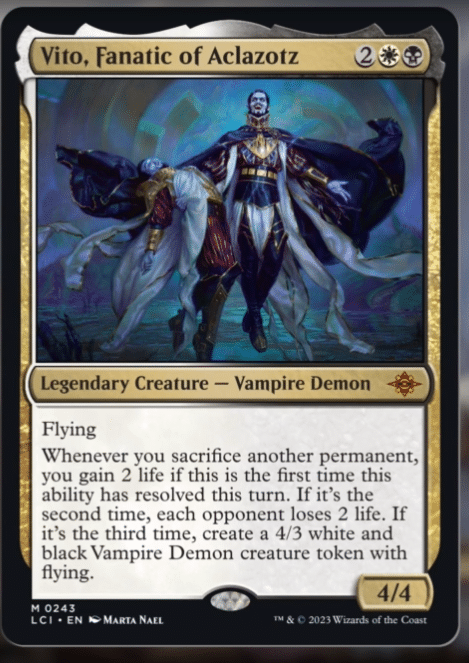 Vito looks to be a fantastic addition to the Vampire Demon themed Commander deck releasing in The Lost Caverns of Ixalan. Vito rewards you for sacrificing permanents in a similar fashion that Omnath, Locus of Creation rewards you for playing lands.