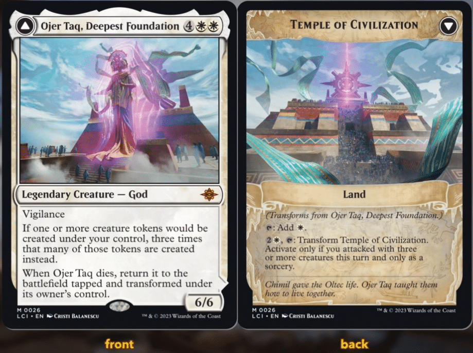 This new God design also shows a new way of representing immortality in a gameplay sense. When Ojer Taq would die, it returns to play as a tapped Temple of Civilization. If you satisfy the requirements of the land, the Temple can flip back into Ojer Taq. Not only is Ojer Taq, ability-wise, a strict upgrade to Anointed Procession, it can also be surprisingly difficult to kill.