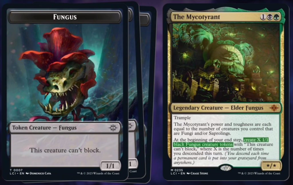 The Mycotyrant introduces one of the new mechanics coming with The Lost Caverns of Ixalan: Descend. There are two variants of this mechanic with the one present on The Mycotyrant referring to an act of Decending. This occurs whenever a permanent card is put into your graveyard.