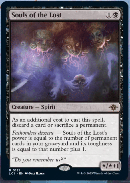 Souls of the Lost showcases the new Fathomless Descent keyword which cares about the total number of permanents in your graveyard. While Souls of the Lost can scale much faster than other Tarmogoyf-esque creatures, it does come at the cost of sacrificing a permanent and discarding a card, which is incredibly heavy.