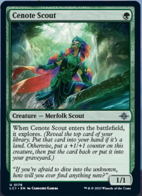 Cenote Scout was actually an MTG card that was supposed to be in the original Ixalan block but did not end up making the cut. This one-mana Explorer did, however, make it into The Lost Caverns of Ixalan.