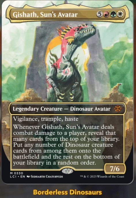 Ironically, we just wrote about this card gaining a ton of value a few weeks ago. Gishath, Sun’s Avatar is the best Dinosaur Commander out there right now. Since Dinos got some support in the MTG Doctor Who crossover and in The Lost Caverns of Ixalan, there was a lot of interest in building Commander decks around Gishath. Fortunately, instead of paying $40+ prices for the card, The Lost Caverns of Ixalan is offering a reprint of Gishath, which should help make it more accessible.