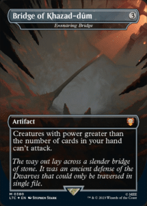 Ensnaring Bridge is a bizarre card that used to be much more prevalent in the Modern format. Able to prevent creatures from attacking with greater power than your hand size, Ensnaring Bridge is capable of stalling for ages. The card still sees some play in Prison Tron variants in Modern, but this is not a very popular archetype at the moment.
