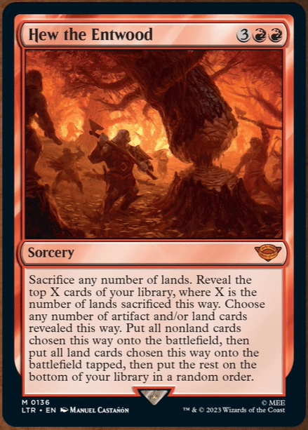 Hew the Entwood may have the most competitive potential of the cards revealed today. Hew the Entwood has some absolutely fantastic flavor, turning your lands and artifacts into cards revealed from the top of your library. There are no limits to the mana value of cards revealed that can be cheated into play. Hew the Entwood is capable of turning a Forest into a Portal to Phyrexia for just five mana! There is definitely build-around potential for this card.