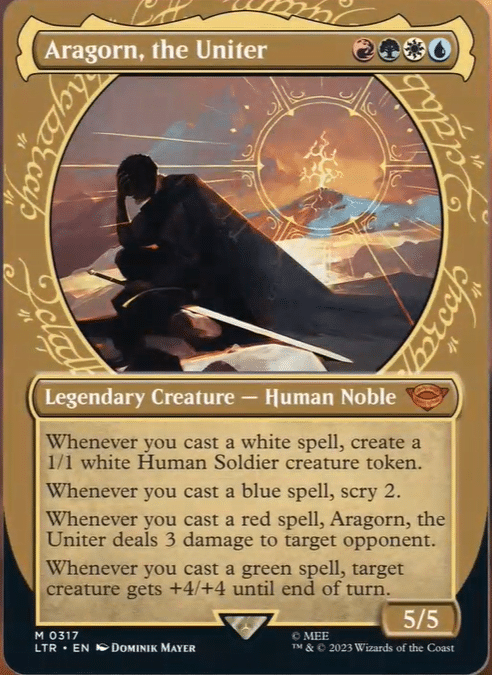 Aragorn, the Unifier looks like a utility Commander similar to the style of Kenrith, the Returned King. There are a lot of different ways to take Aaragorn since it’s capable of doing a bunch of different things. Generally, the most interesting path is to cast multicolored spells to get multiple payoffs.
