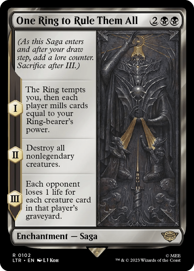 Otherwise, Sauron does it all. He creates an Army, provides card advantage, and flavorfully capitalizes on the Ring Tempts You mechanic. Once again, Sauron seems to heavy of a mana investment for competitive formats, but it looks like an absolute slam dunk as a potential Commander, or even a refill option in other Grixis decks.